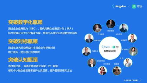 据了解,金蝶智慧成长计划首期为一年,目标是助力万家中小微企业健康成长,3年惠及百万中小微企业,5年惠及千万中小微企业。为了打造更接地气的企业管理模式,金蝶集团与陈春花教授一起发起中国管理模式50人+论坛,通过对中国标杆性企业的总结、探索,让成千上万中小企业找到可参考范例。成思危先生曾经讲过一句话“照搬外国管理模式不大可能搞好中国企业”。所以,中国管理模式50人+论坛的最终目标是,帮助中小微企业突破对标瓶颈。