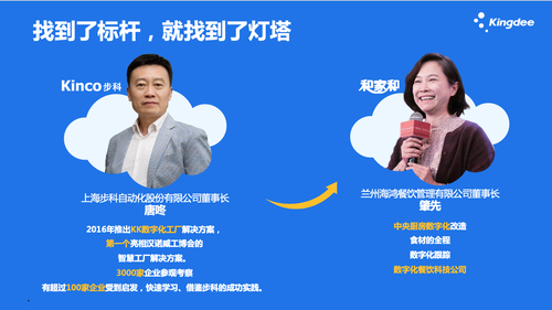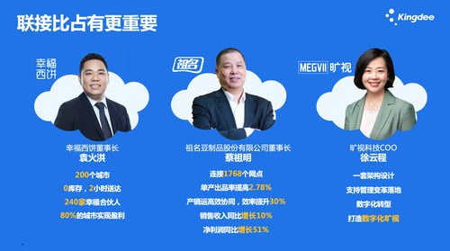 徐少春认为,在数字化转型时代,联接比占有更重要。在过去二十多年的行业实践中,金蝶为很多客户成功进行了数字化转型。比如:幸福西饼,数字化转型战略让这家企业进入了新零售领域,在200个城市实现了零库存,生鲜两小时送达。再比如:祖名豆制品,一个简单的豆制品企业,营业额却超过了10个亿,连接了1768个网点,单产出品率提高了2.78%。还有旷视科技,不仅通过大数据、视频技术精准地识别人的感知能力,同时通过新的组织架构变革实现了企业管理能力的提升。