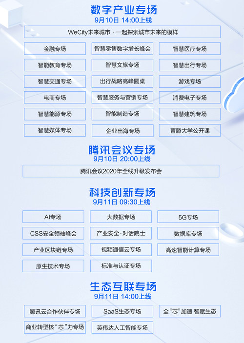 疫情期间为远程办公协作提供支撑的腾讯会议,将于9月10日晚间带来2020年全线升级发布,助力企业构建云上极致连接;AI、5G、区块链、数据库、大数据、视频通信、安全、高速智能计算等技术专场,则将解读技术最新发展趋势,揭晓腾讯重点技术演进的新成果。