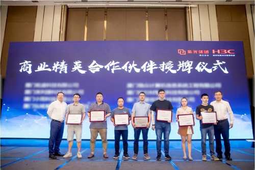 新华三集团福建代表处总经理张栋(左1)为商业精英合作伙伴授牌