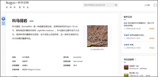 除了考虑到编写词条的用户外,对于希望能够获得专业知识的搜狗科学百科查询用户,平台利用更专业、更直观的展现方式帮助他们了解词条的学术概念。以“科马提岩”这一词条为例,国内目前其他百科中仅有简介、化学组成、结构构造和地质意义四个板块,并且每个内容仅是信息罗列,看完还是很难理解其概念,而在搜狗科学百科中,词条中从“科马提岩”的发现、成因、分类,再到研究意义均有详细介绍,而且还有具体的结构模型、分异过程等学术研究。