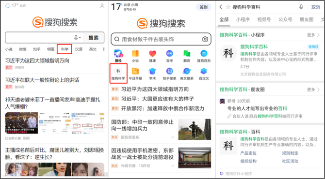 搜狗科学百科目前已经正式上线,用户直接搜索产品官网就能查询科学领域专业百科词条(官网链接:https://baike.sogou.com/kexue/home.htm);在搜狗搜索PC端及Wap端导航栏点击“科学”选项,也可直接进入搜狗科学百科首页;在搜狗搜索APP中,用户可以在首页自定义选项中增加“科学”选项,点击后可直接跳转至科学百科首页。另外,在微信内输入产品名称进行搜索,可以直接使用体验搜狗科学百科小程序。