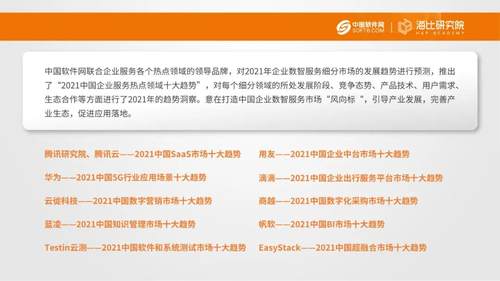在本次大会上,中国软件行业协会、中国软件网联合企业服务各个热点领域的领导品牌,对2021年企业数智服务细分市场的发展趋势进行预测,推出了“2021中国企业服务热点领域十大趋势”。具体包括SaaS、企业中台、5G行业应用场景、BI、数字营销、知识管理、超融合、数字化采购、产业互联网、软件和系统测试、企业出行等企业数智服务热点领域。对每个细分领域的所处发展阶段、竞争态势、产品技术、用户需求、生态合作等方面进行了2021年的趋势洞察。
