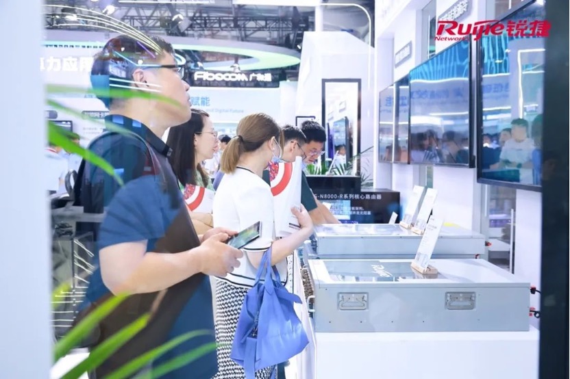 随着全球数字化转型的深入,5G ToB、企业上云、AR/VR等新业务需求不断涌现,对“算力网络”的差异化需求持续攀升。锐捷网络作为算力网络解决方案提供商,在算力承载展区,展示了智算网络、硅光液冷、400G和核心路由器等新产品方案。