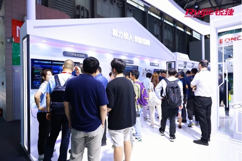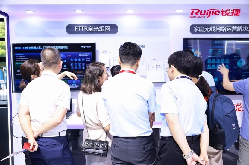 在智能组网板块,锐捷展出了面向家庭和中小微企业的全场景智能组网解决方案,从AC+AP全屋智联、FTTR全光组网、加上智能化的Wi-Fi运营管理平台,为家庭用户提供优质网络体验,协助运营商保障全流程家宽业务体验及增值创收工作,点亮千企万家的数智新生活。