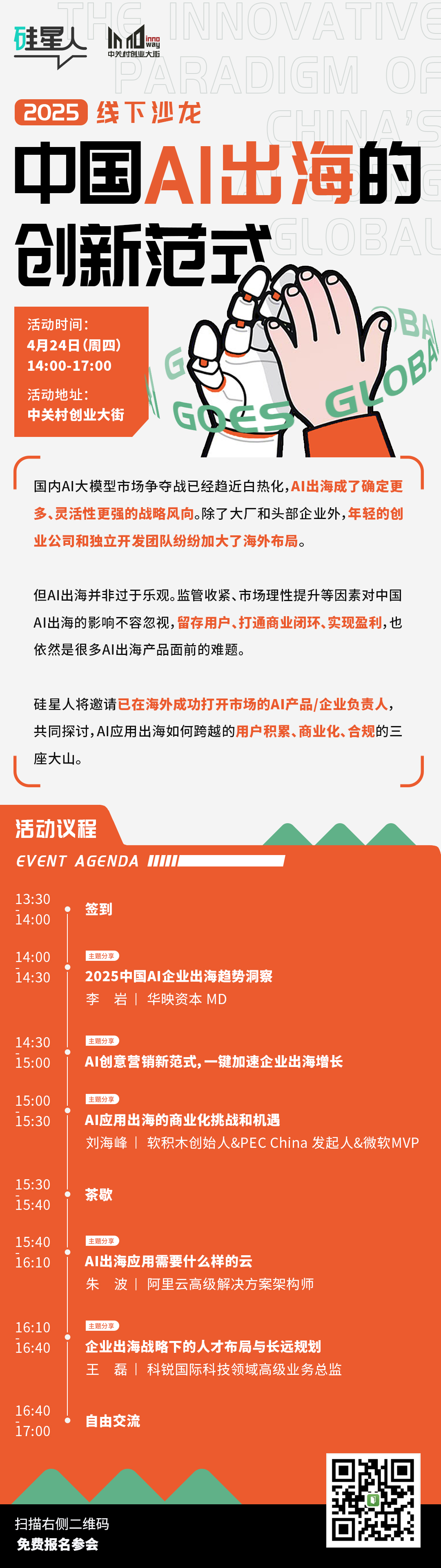 本周四下午,硅星人联合中关村创业大街,共同举办“中国AI出海创新范式”主题活动,本次活动将汇聚AI产业投资人、超酷的AI应用产品团队,实力强劲的云厂商,助力远航的出海服务平台,他们将分享出海实战经验,聊聊如何突破技术壁垒,怎样精准投流,还有哪些细分赛道的新机遇。