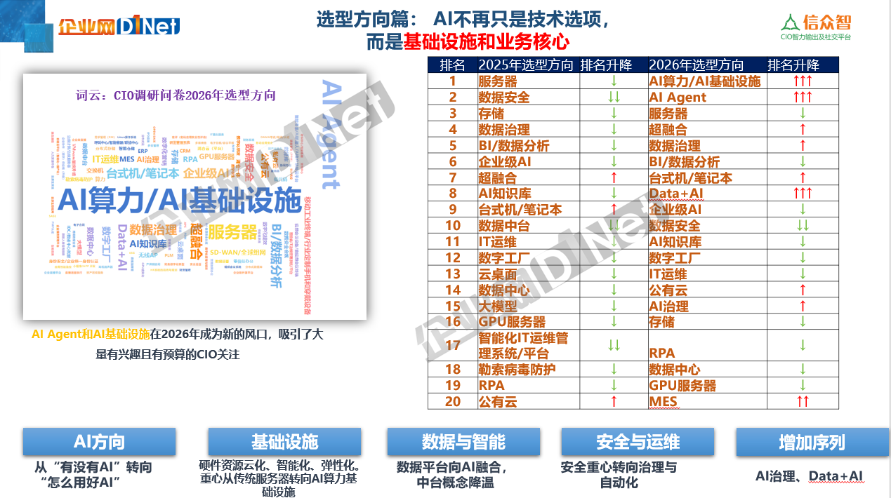 彭俊在演讲中还指出,当AI Agent颠覆传统认知,当算力基础设施取代服务器成为新战场,CIO群体正经历着前所未有的职业危机——平均3-5年的任期背后,是经济下行压力、业务价值交付困境与网络安全合规的三重绞杀。2025年预算回暖信号中,央国企成为投资主力军,但RPA等传统领域优化与存储设施投入放缓的现实,揭示着技术选型的结构性变革:数据平台向AI融合、安全重心转向治理自动化,中台概念逐渐褪色。