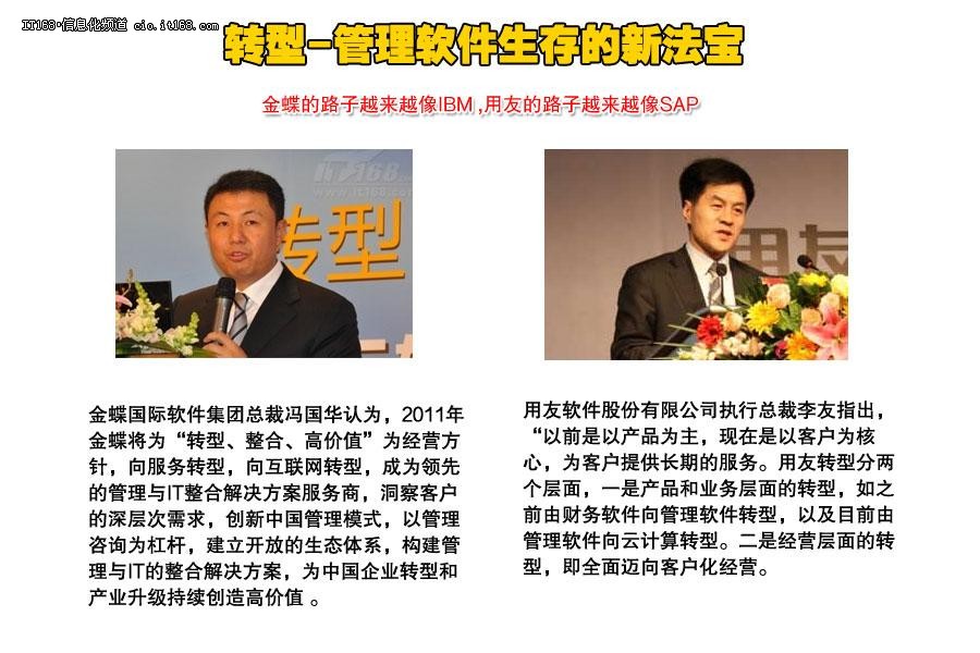 相关评论人士称,从户外广告看,用友叫“企业管理软件”,而金蝶从2008年开始,则正式转型“企业管理专家”。微妙的差别还在于,近几年来,用友曾多次公开叫板SAP,强化亚太最大的管理软件龙头角色,而金蝶则凭借其管理与IT整合解决方案吸引IBM作为战略投资者,拓展其全球战略。