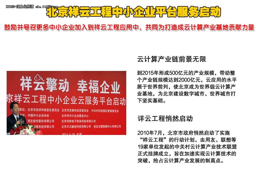 北京市经济和信息化委员会正式授牌用友为北京祥云工程示范项目,用友公司将具体承接云计算平台的搭建与实施推广。