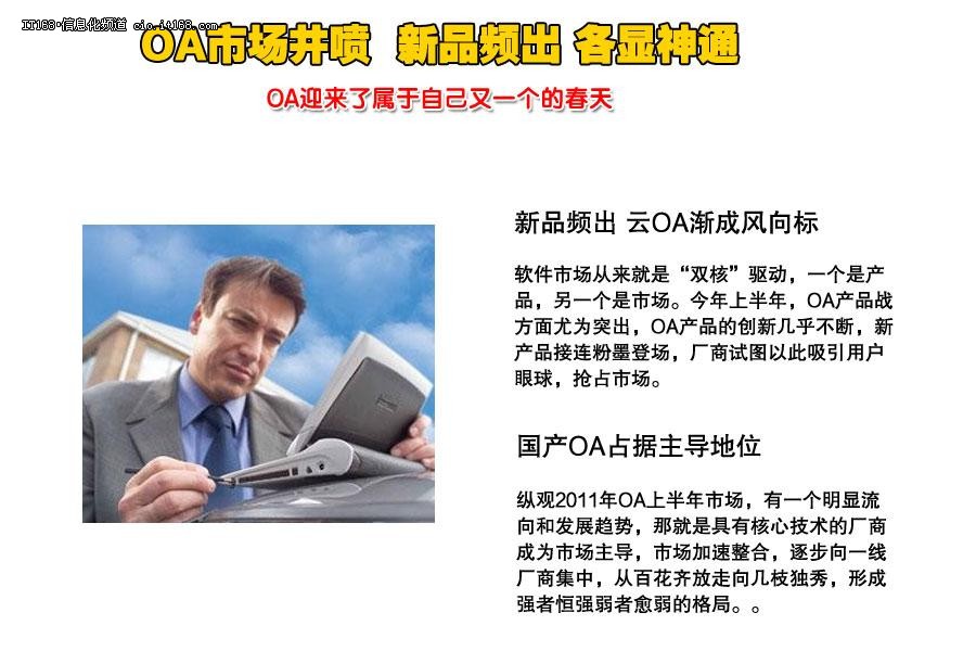 软件市场从来就是“双核”驱动,一个是产品,另一个是市场。今年上半年,OA产品战方面尤为突出,OA产品的创新几乎不断,新产品接连粉墨登场,厂商试图以此吸引用户眼球,抢占市场。