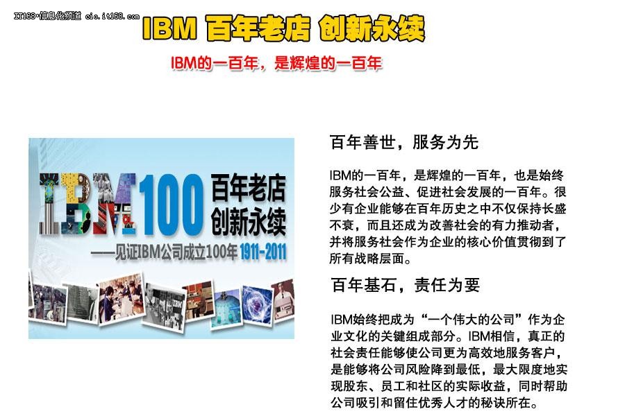 在企业的发展过程中,IBM始终将企业社会责任与先进的技术和优秀的人才看作是其最宝贵的财富,坚持以IBM的顶尖技术产品和全面解决方案为基础,通过具备一流专业技术员工们的服务,直接参与到社会公益活动中,为社会做出务实的贡献。可以说,IBM这家公司,就是以服务客户、服务社会、服务员工的精神建立起来的公司。
